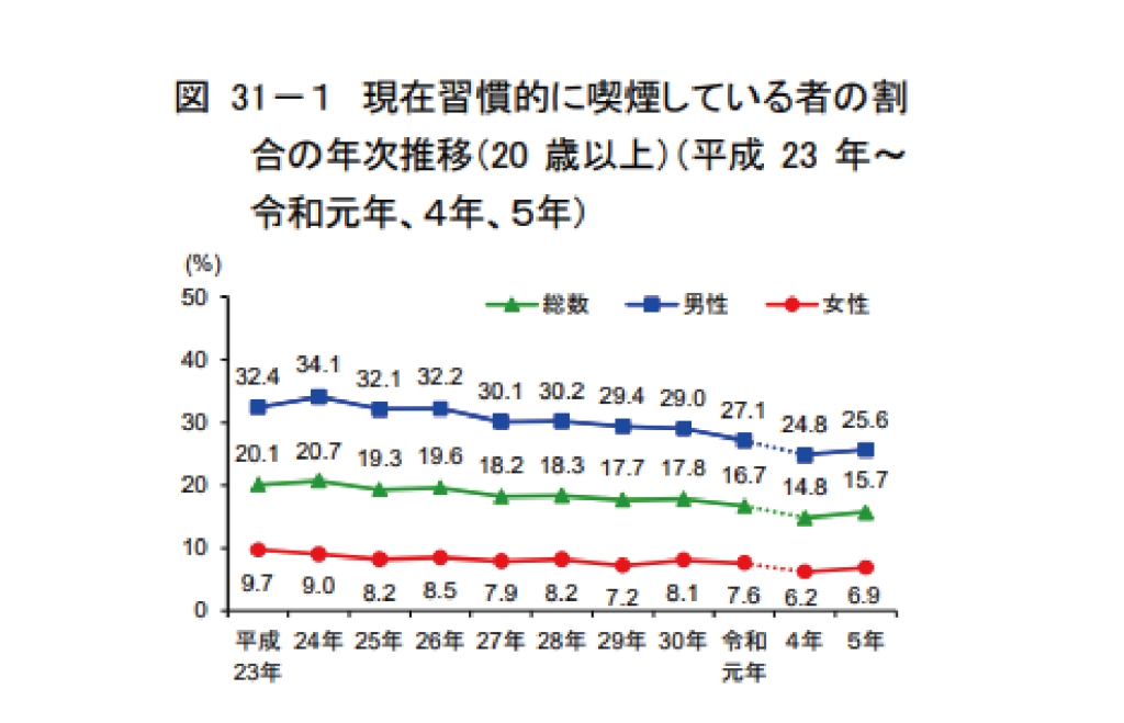 厚生労働省の「国民健康・栄養調査」によると、日本の成人喫煙率は長期的に減少が続いています。